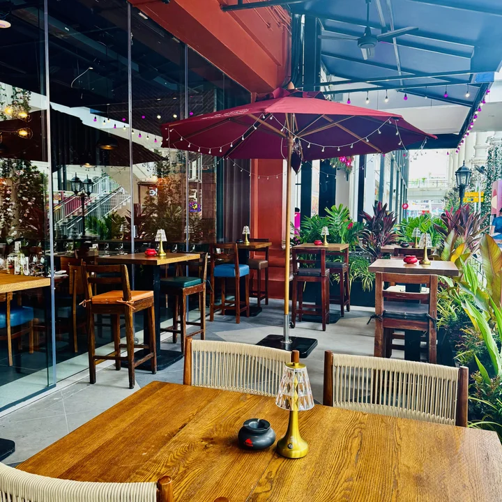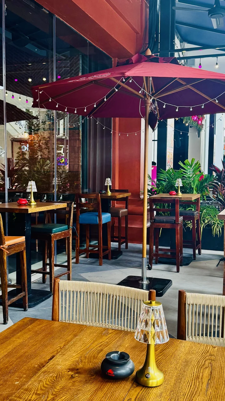 The outdoor seating is surrounded by lush greenery and accented with fairy lights under a striking red umbrella. Positioned right at the shopping center’s frontage, it offers a vibrant and inviting ambiance — ideal for dining while enjoying the bustling energy of Patong.