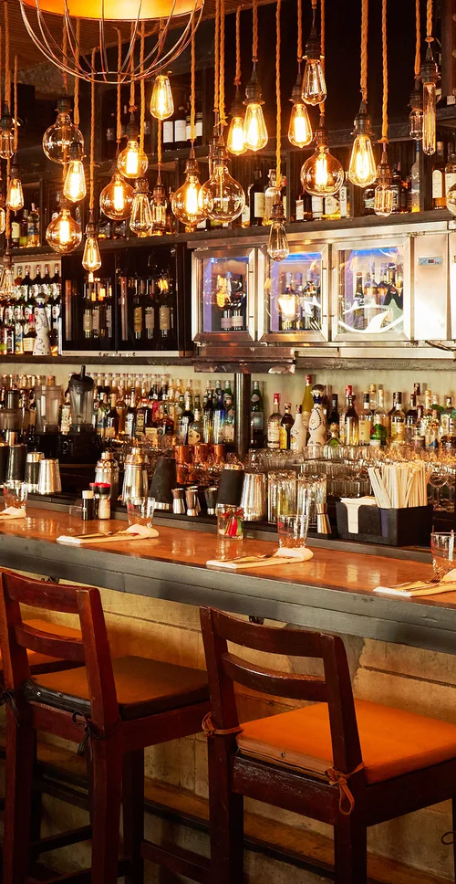 The restaurant is a single-floor open space with our signature inviting bar, including 130 seats and a large balcony for outdoor seating, allowing a stunning view of the bustling street.